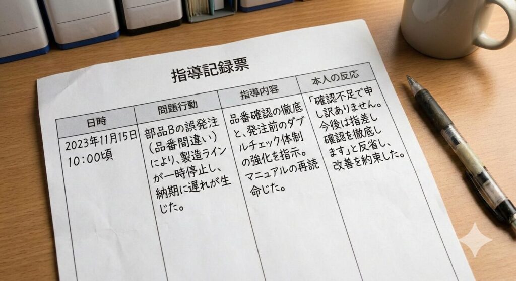 鉄則1:「指導記録票」を残す(最重要) 「言った言わない」を防ぐために、問題行動の記録は必須です。 メモ程度でも構いませんが、以下の5W1Hを意識して記録してください。