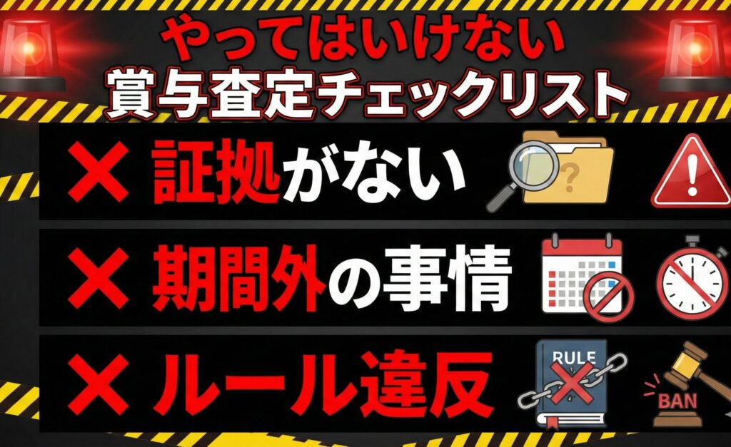 鉄則2:合理的な理由を説明できるようにする 特定の社員だけ極端に査定を下げる場合(例:平均は2.0ヶ月分なのに、その社員だけ0.5ヶ月分など)、「なぜそこまで低いのか」を第三者に説明できなければなりません。 「なんとなく気に入らない」は通用しません。「○○のミスにより業務が××時間遅延した」「指導を〇回無視した」といった客観的な事実が必要です。